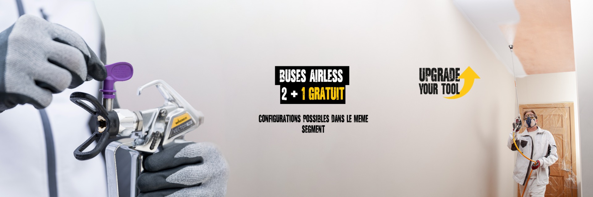 - Équipement de pulvérisation de peinture Airless: Sous l'effet d'une forte pression du matériau, la peinture est forcée et atomisée à travers un petit orifice (embout de pulvérisation). Les séries de pulvérisateurs de peinture WAGNER les plus connues sont la série Control Pro (modèles d'entrée de gamme), la série PowerPainter (pour les professionnels effectuant des travaux plus importants), la série ProSpray (pour les professionnels effectuant fréquemment des travaux de pulvérisation) ou la série SuperFinish (pour les travaux de pulvérisation professionnels les plus exigeants).