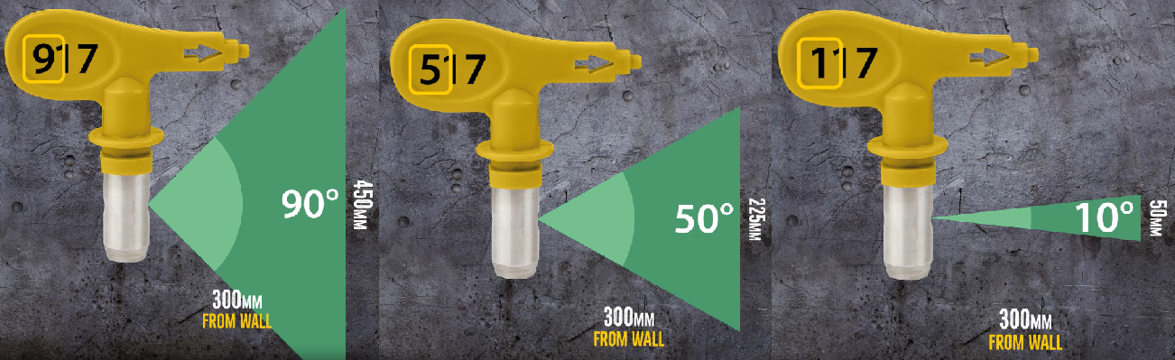 Bij Airless verfspuiten kun je veel verschillende spuittips kopen. Wagner houdt de volgende maatduiding aan: